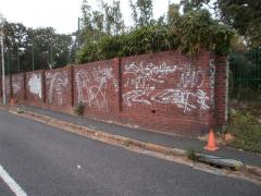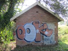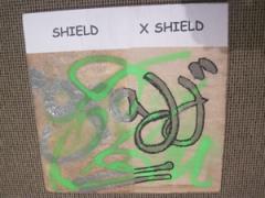 Graffiti SAC shield on sandstone tile, treatment on left part |
